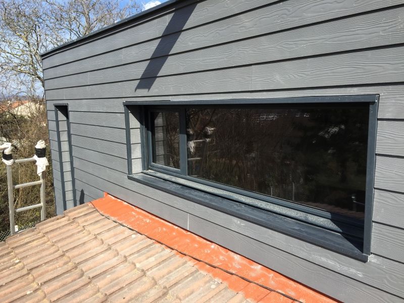 Pose des menuiseries et bardage composite sur l'ossature bois